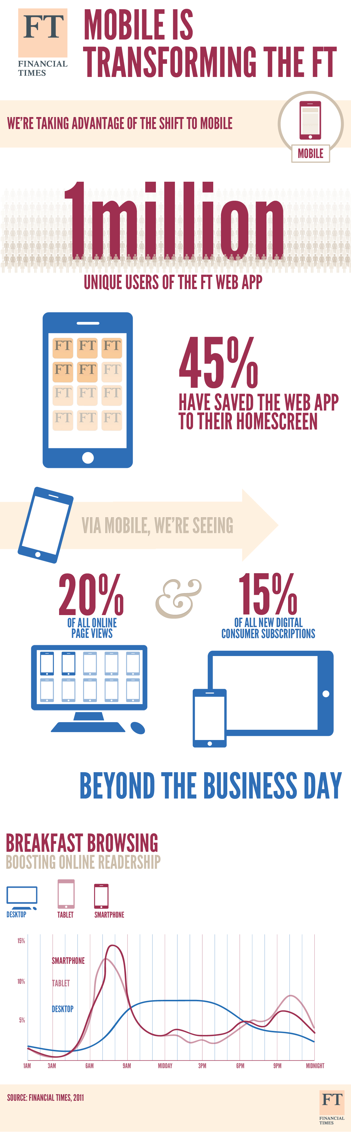 In less than six months, FT’s (Financial Times) new Mobile App has registered more than one million users. If you recall my posting from July, FT launched the HTML5 Mobile Website to bypass Apple’s iTunes App Store and the 30% commission to Apple for content subscriptions. If you think mobile is just a marginal event for FT – think again. According to their own Website, mobile and tablet devices account for 20% of total page views.
