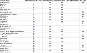 While almost 75% of the top 30 Internet retailers provided a mobile optimized site, not a single one of those was tailored for the iPad in order to maximize the shopping experience on a tablet. This is particularly surprising for companies like Apple and Amazon, who are driving a significant portion of their revenue from tablets and tablet optimized products.